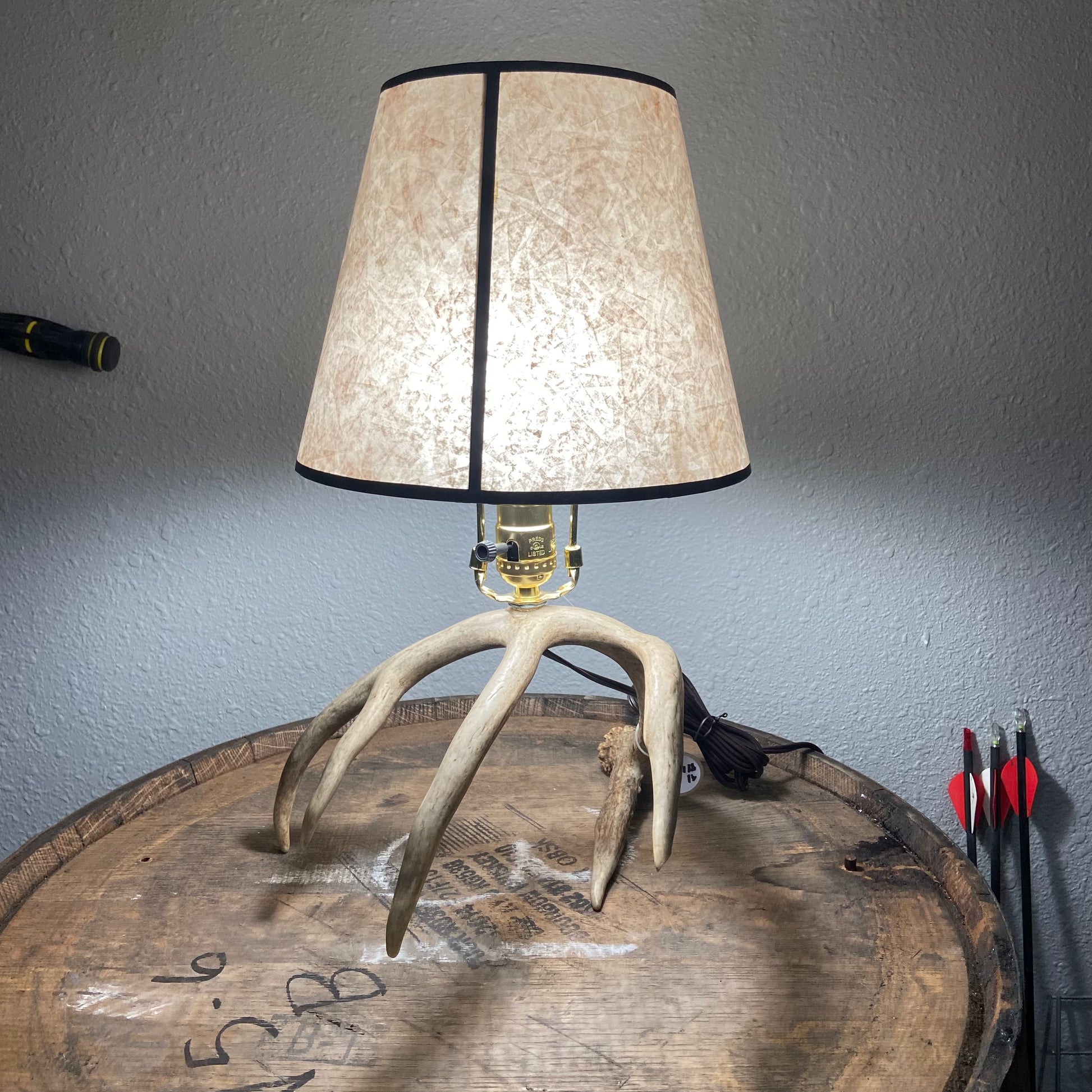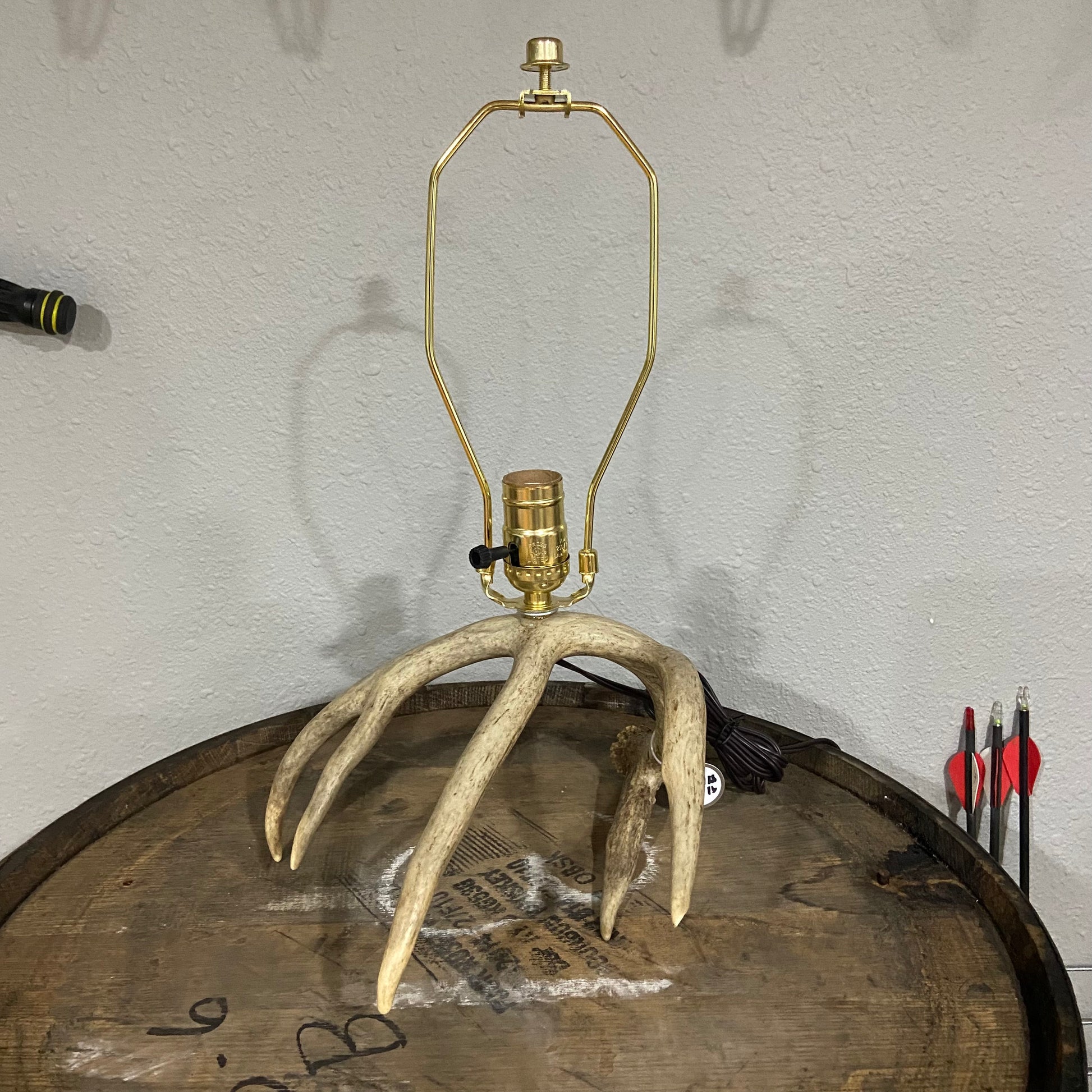 This is the perfect lamp for any nightstand or end table. It is a single 5 point antler. All you need is the lamp shade of your choice along with a lightbulb. (A)